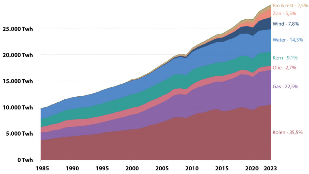 De wereldwijde energievoorziening is nog steeds voor het belangrijkste deel afhankelijk van fossiele brandstoffen.