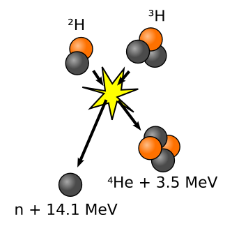 Deuterium en tritium smelten samen onder invloed van een grote hoeveelheid kinetische energie en een zeer hoge temperatuur. Daarbij vormt een heliumkern, een neutron en een grote hoeveelheid energie. Hieronder wordt de reactie op atoomniveau gepresenteerd.