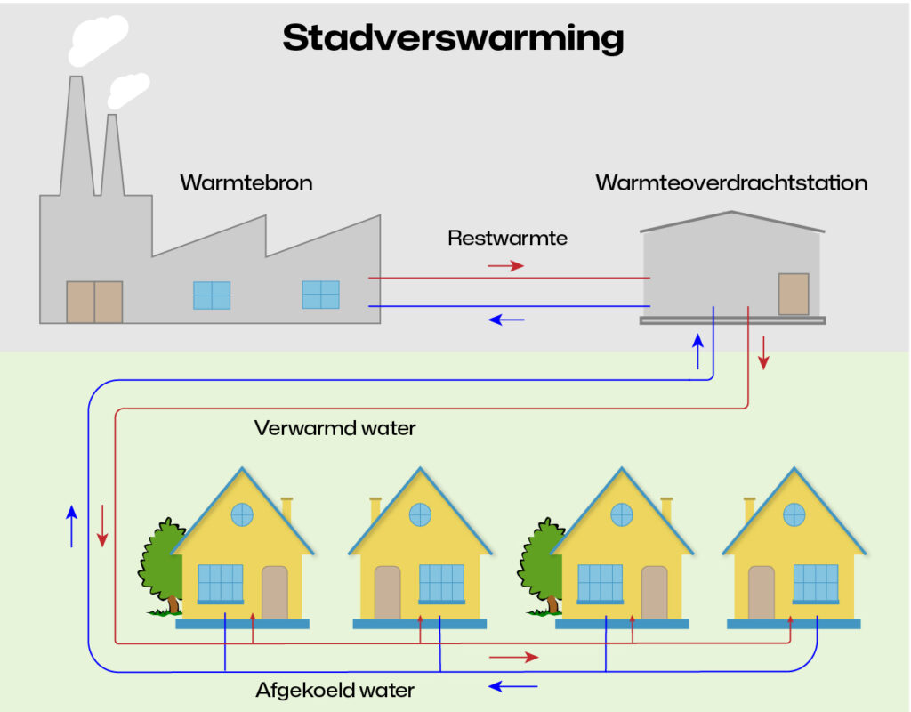 In de onderstaande figuur wordt schematisch uitgelegd hoe stadsverwarming werkt. Daaronder staat een tekstuele uitleg.
