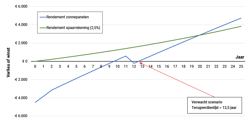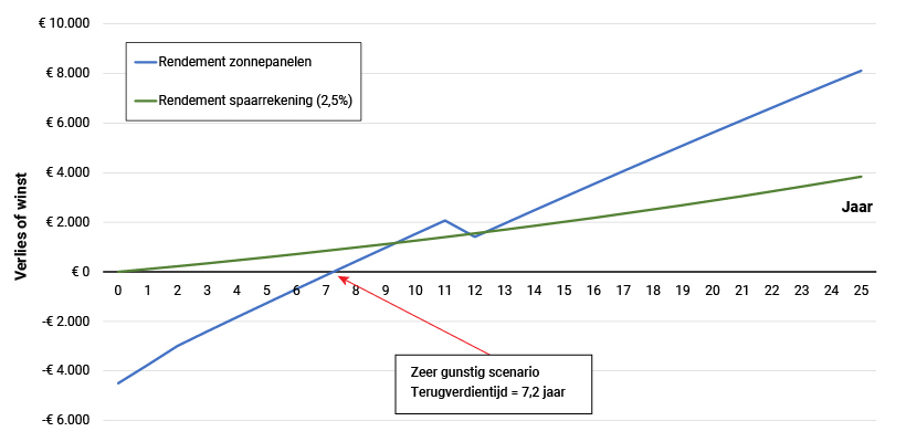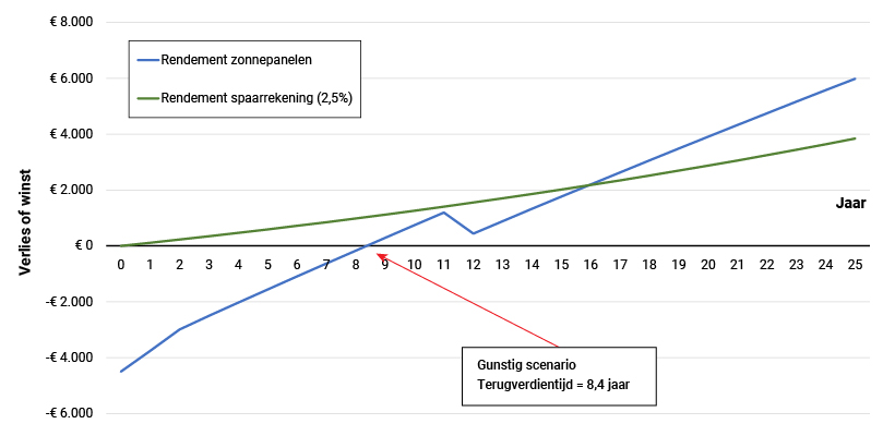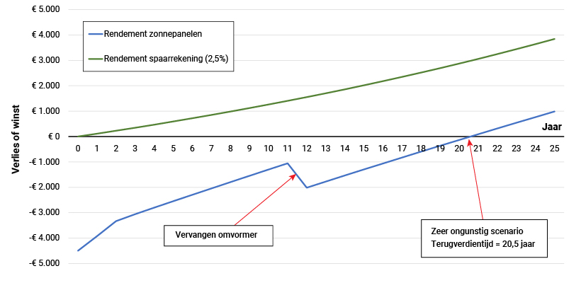 In dit scenario levert een spaarrekening met een rente van 2,5 procent na 25 jaar een winst op die 2.857 euro hoger is dan de financiële winst behaald met zonnepanelen.