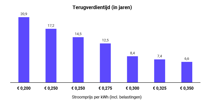 Voor de berekening van de terugverdientijd in bij een wisselende investeringskosten wordt aangenomen dat de all-in elektriciteitsprijs 27,5 cent per kilowattuur bedraagt en energieleveranciers klanten een redelijke vergoeding (50 procent van de kale stroomprijs) bieden voor de stroom die zij aan het elektriciteitsnet terugleveren.