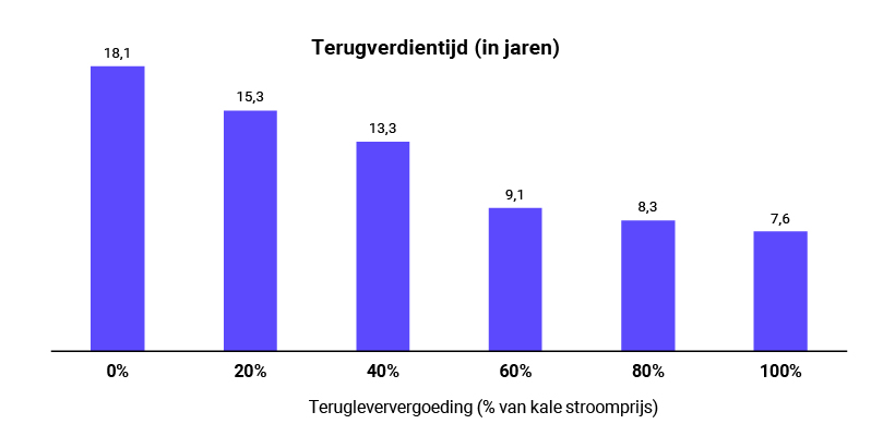 Voor de berekening van de terugverdientijd bij wisselende investeringskosten wordt aangenomen dat de energieleveranciers klanten een redelijke vergoeding (50 procent van de kale stroomprijs) bieden voor de stroom die zij aan het elektriciteitsnet terugleveren.