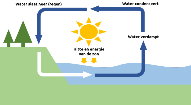 Om te begrijpen hoe en waarom de kracht van water gebruikt kan worden als een duurzame energiebron, is het belangrijk om eerst de watercyclus (waterkringloop) in kaart te brengen.
